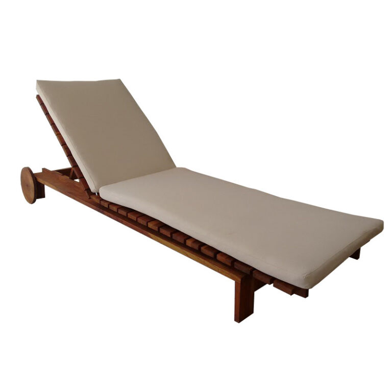 Descripción: Camastro con ruedas de madera natural para exterior modelo Cama con sistema de inclinación en el respaldo de 4 posiciones. Los cojines son de poliuretano de alta densidad con forro de tela acrílica para exteriores. (tono a escoger, se venden por separado).