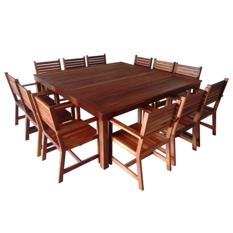 Descripción: Comedor cuadrado de madera natural para exterior para 12 personas modelo Mallorca. Los cojines son de poliuretano de alta densidad con forro de tela acrílica para exteriores. (tono a escoger, se venden por separado).