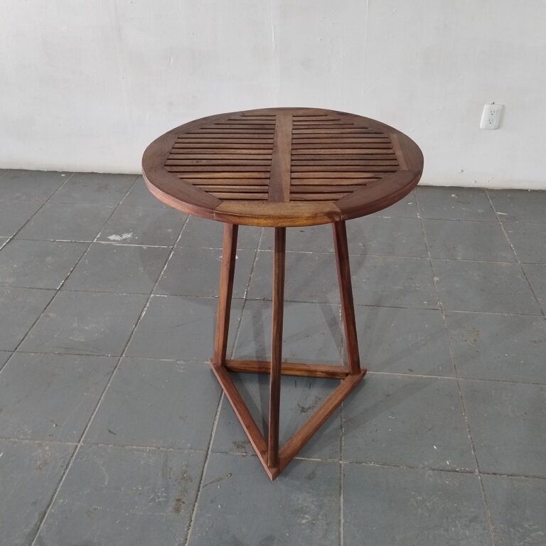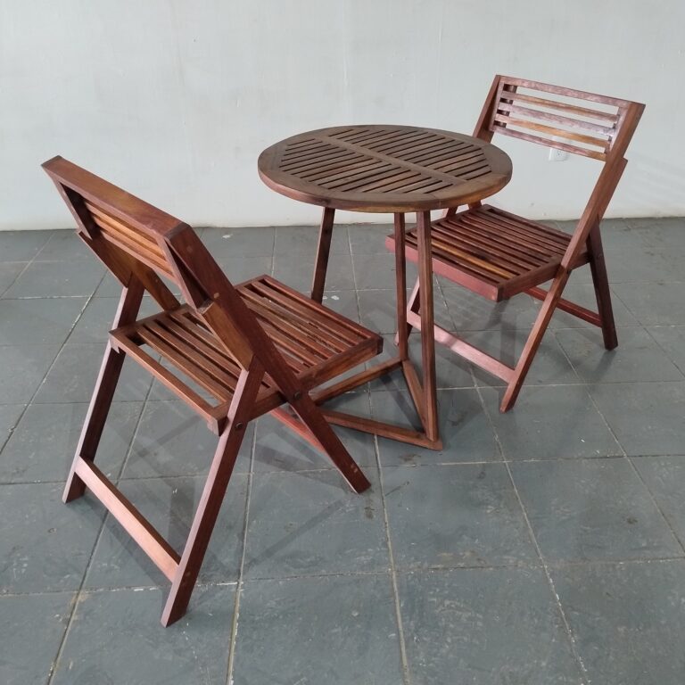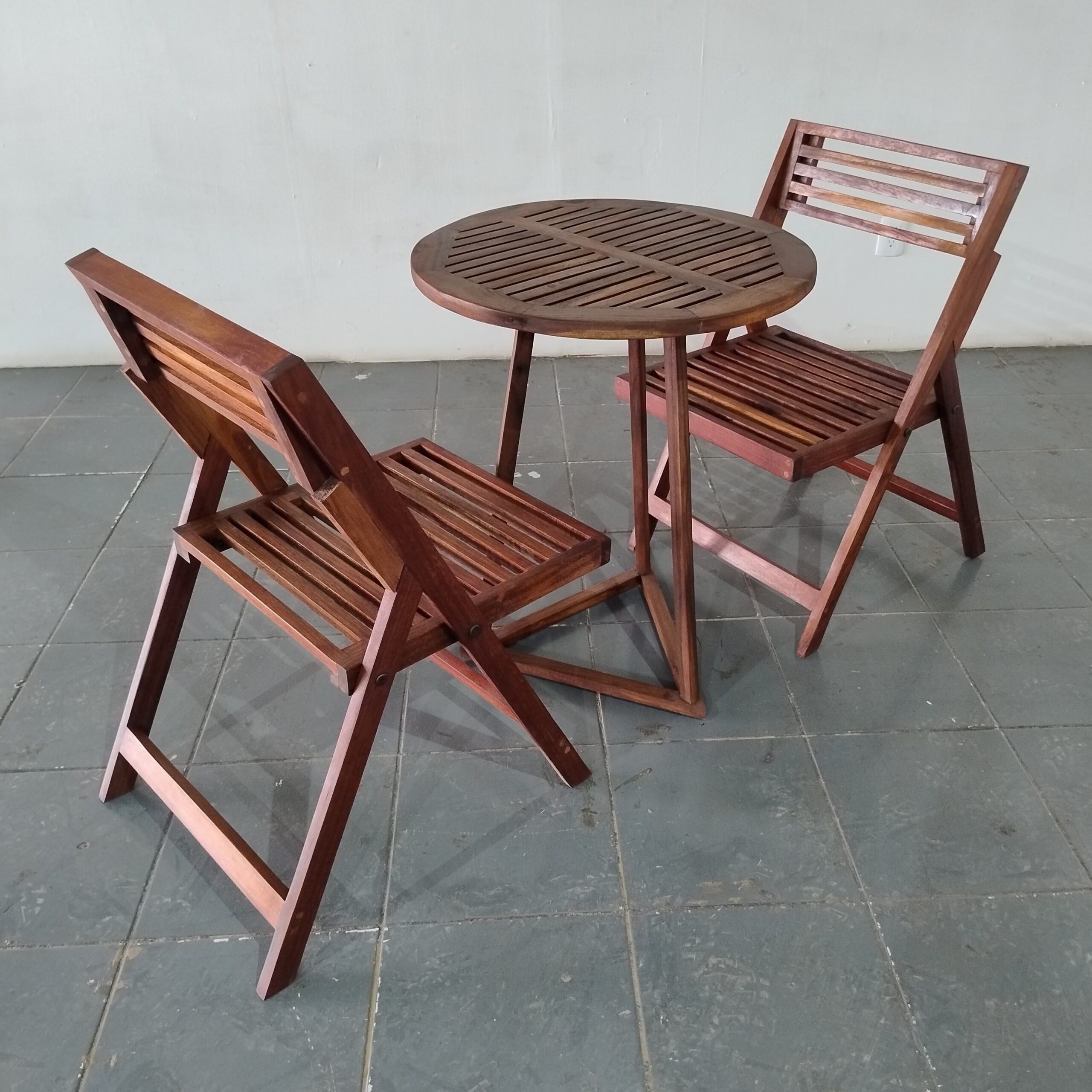 Descripción: Comedor redondo con sillas pleglables de madera natural para exterior marca Mubox para 2 personas.