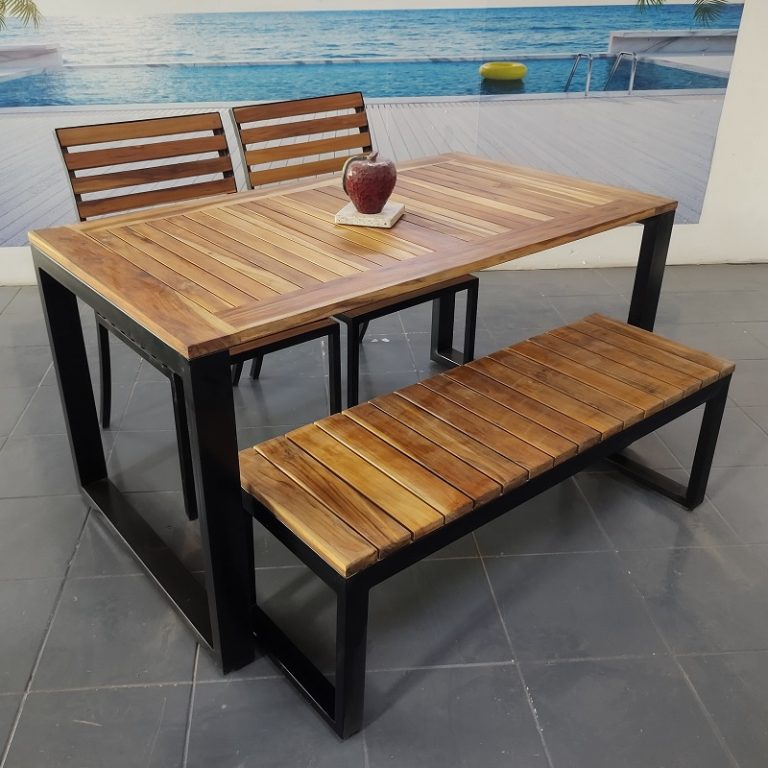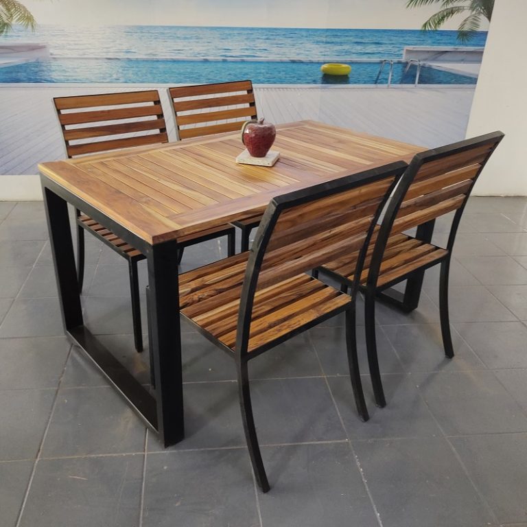 Descripción: Comedor de madera natural para exterior y bastidor de acero acabado pintura electrostática (tono a escoger) para 4 personas modelo Coruña. Los cojines son de poliuretano de alta densidad con forro de tela acrílica para exteriores. (tono a escoger, se venden por separado).