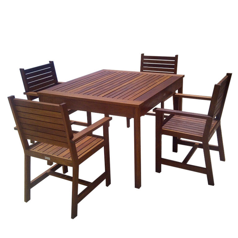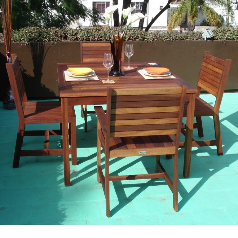 Medidas: Mesa: Largo:100 cm. Ancho:100 cm. Alto:75 cm., Silla S/D: Frente:50 cm. Fondo:57 cm. Altura:90 cm., Silla C/D: Frente:58 cm. Ancho:57 cm. Alto:90 cm., Cojines: 5 cm. de espesor.