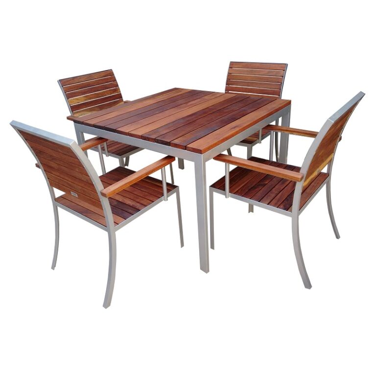 Descripción: Comedor de madera natural para exterior y bastidor de acero acabado pintura electrostática (tono a escoger) para 4 personas modelo Mediterráneo. Los cojines son de poliuretano de alta densidad con forro de tela acrílica para exteriores. (tono a escoger, se venden por separado).