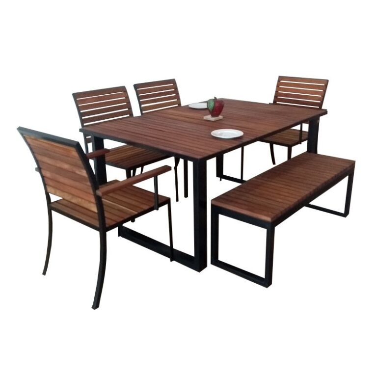Descripción: Comedor de madera natural para exterior y bastidor de acero acabado pintura electrostática (tono a escoger) para 6 personas modelo Coruña. Los cojines son de poliuretano de alta densidad con forro de tela acrílica para exteriores. (tono a escoger, se venden por separado).