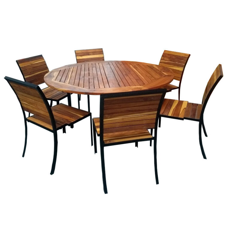Descripción: Comedor redondo de madera natural para exterior y bastidor de acero acabado pintura electrostática (tono a escoger) para 6 personas modelo Cataluña. Los cojines son de poliuretano de alta densidad con forro de tela acrílica para exteriores. (tono a escoger, se venden por separado).