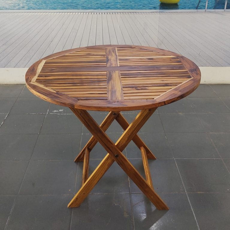 Descripción: Mesa redonda plegable de madera natural para exterior marca Mubox.
