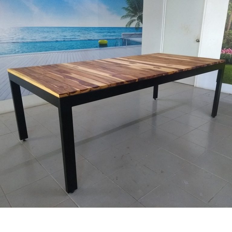 Descripción: Mesas de madera natural para exterior con bastidor de acero acabado pintura electrostática (tono a escoger) modelo Mediterráneo para 8 personas.