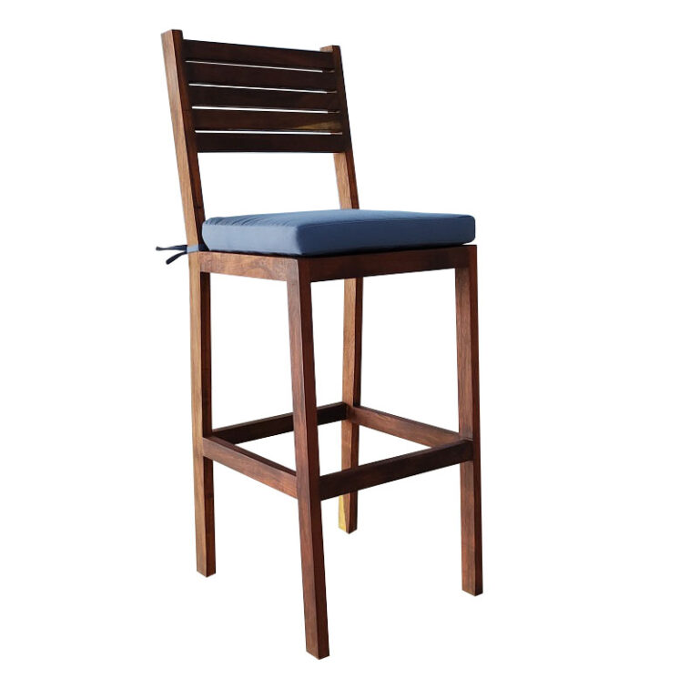 Descripción: Banco periquero para barra de bar de madera natural para exterior modelo Mallorca. Los cojines son de poliuretano de alta densidad con forro de tela acrílica para exteriores. (tono a escoger, se venden por separado).
