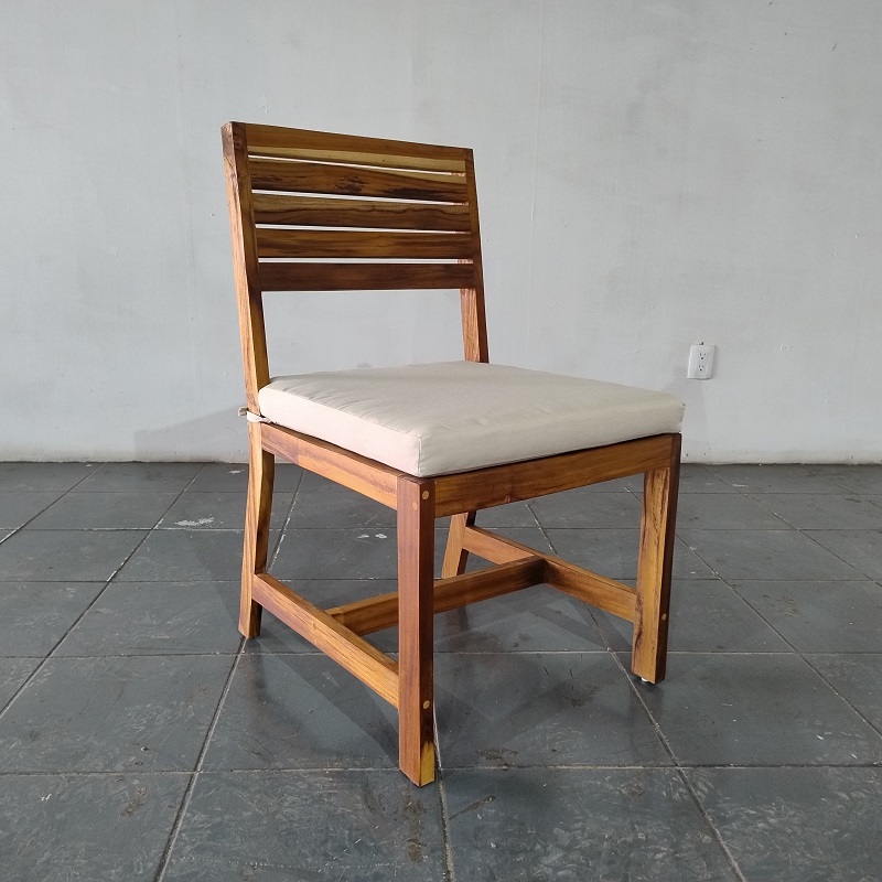 Descripción: Silla sin descansabrazo de madera natural para exterior modelo Mallorca. Los cojines son de poliuretano de alta densidad con forro de tela acrílica para exteriores. (tono a escoger, se venden por separado).