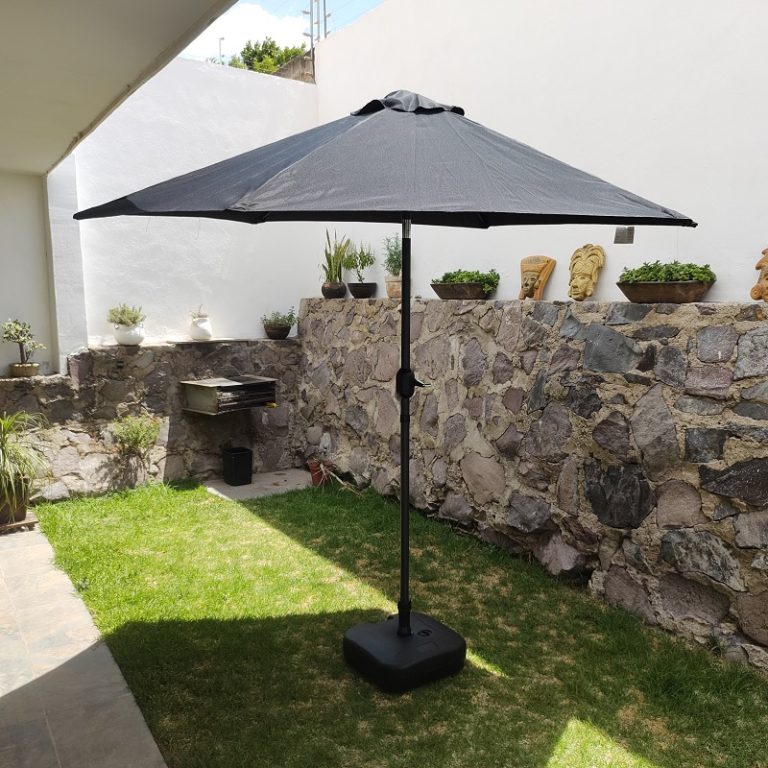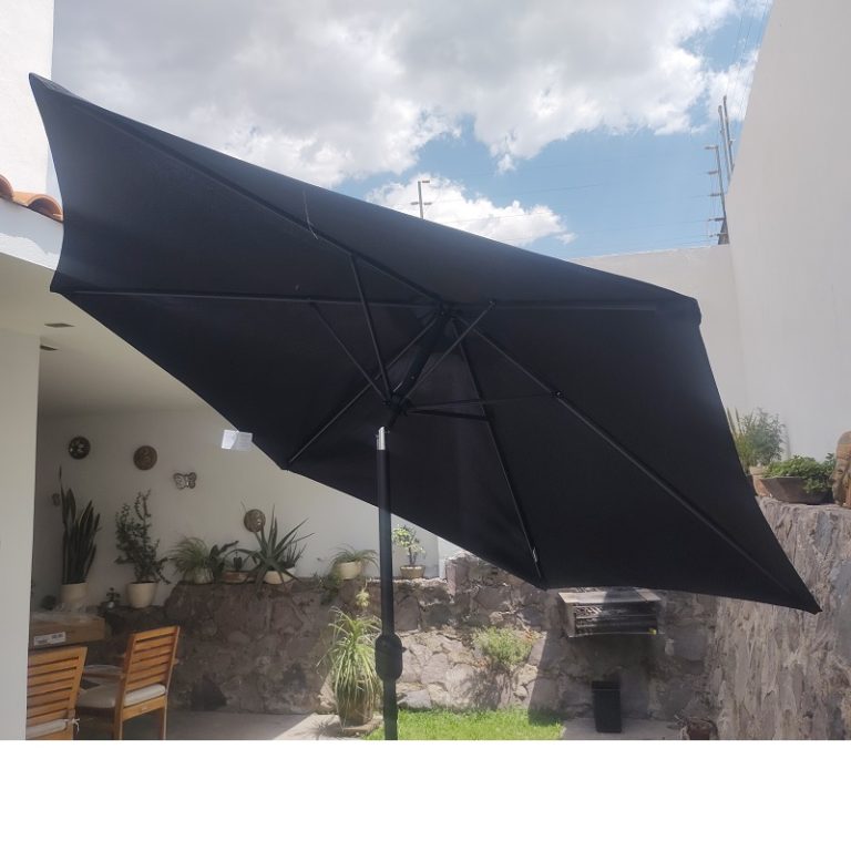 Descripción: Sombrilla central con ángulo de inclinación de acero (negro) con tela para exteriores de poliéster (varios colores) modelo Lugo. No incluye base